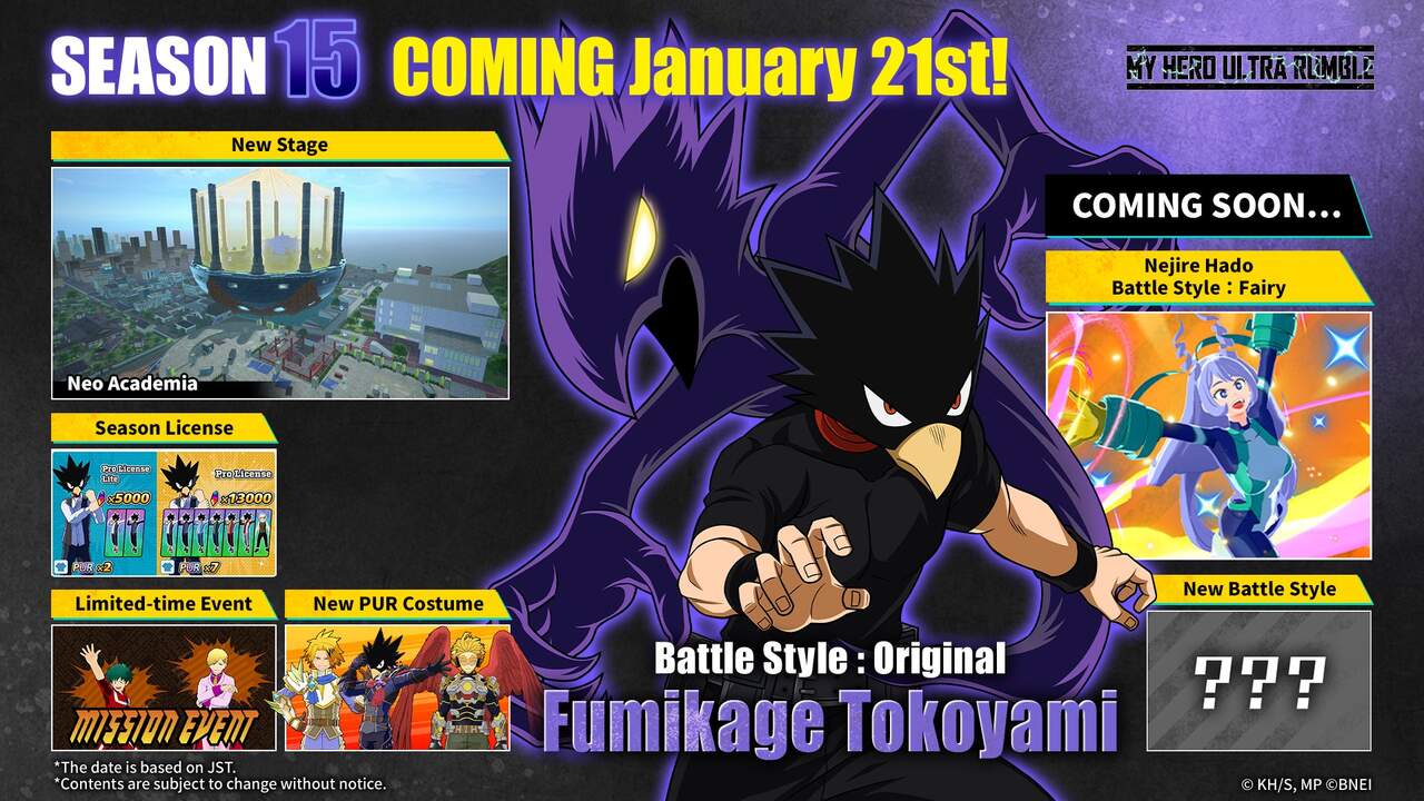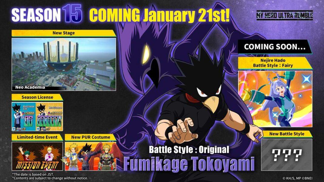 A 15.ª temporada de MY HERO ULTRA RUMBLE já está disponível, trazendo consigo uma série de novidades que prometem enriquecer a experiência de jogo. A maior adição a esta temporada é Fumikage Tokoyami, um novo herói da Classe 1-A, que promete trazer um estilo de combate único e arrojado.
