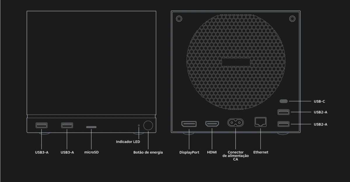 I/O DisplayPort 1.4 (até 4K 240Hz / 8K 60Hz) c/ HDR, FreeSync, ligação em cadeia; HDMI 2.0 (até 4K 120Hz) c/ HDR, FreeSync, CEC; ethernet gigabit; USB-C 3.2 Gen 2 de 10Gbps; 4x portas USB-A (2x USB 3 frontal, 2x USB 2 traseiro); 2×2 Wi-Fi 6E; antena BT dedicada; radio Steam Controller 2.4GHz dedicado