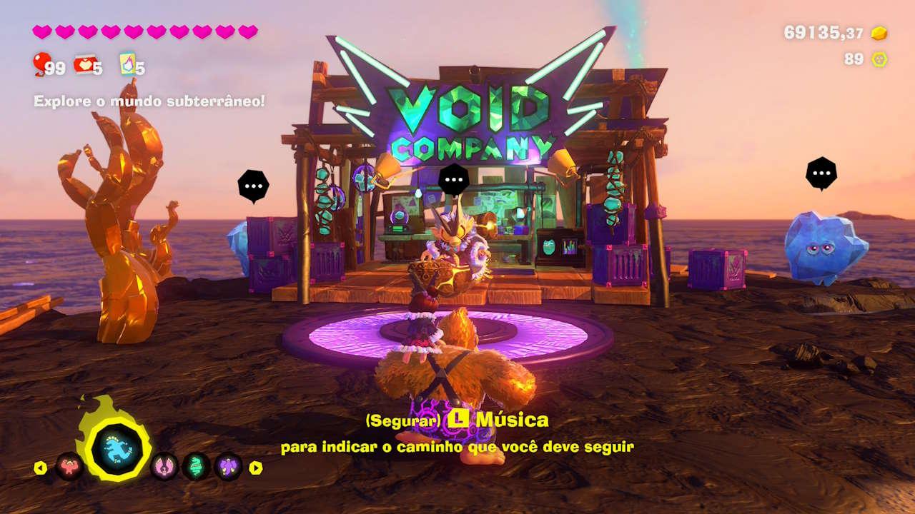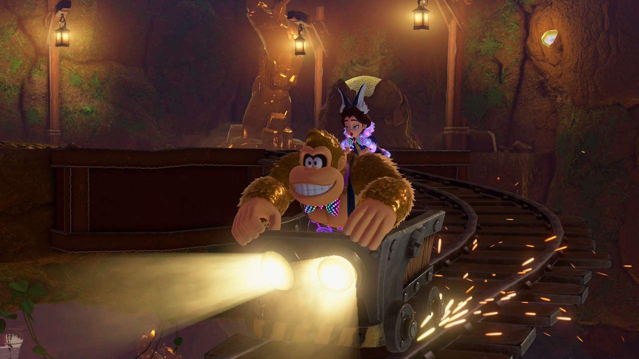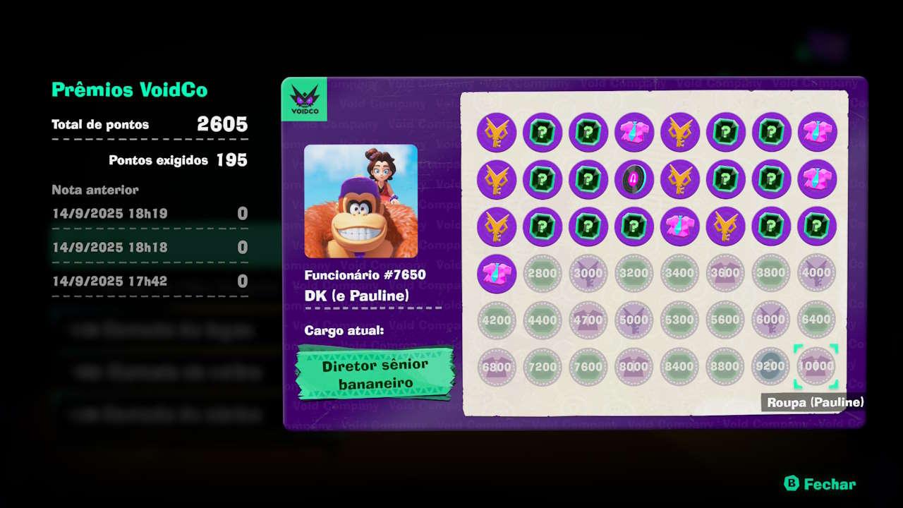 Passando para o novo modo de jogo, a história é simples, mas funciona bem para fazer a ligação com a história principal. Na Ilha DK, encontramos Void Kong e a sua empresa, a Void Company, onde ele continua a ser o presidente, mas também o único funcionário. Ao falar com ele, percebemos que já não está interessado em ouro nem no núcleo do planeta, mas sim em esmeraldas — muitas esmeraldas. Basicamente, pede-nos para nos tornarmos funcionários dele e recolher o máximo de esmeraldas possível. Por parecer algo divertido, Donkey Kong e Pauline aceitam o desafio e tornam-se trabalhadores da Void Company.