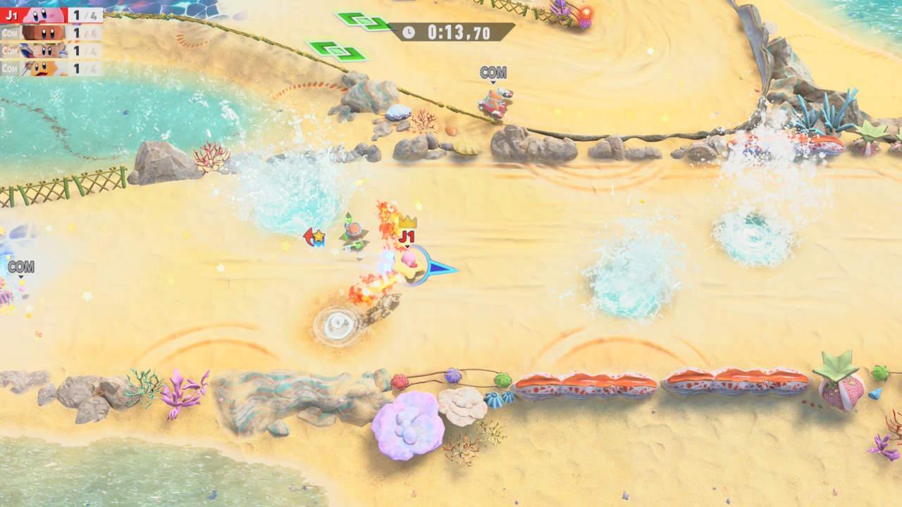Os eventos aleatórios continuam a ser um dos traços mais característicos deste modo, desde tempestades que bloqueiam áreas, meteoros que caem do céu, passagens para outras dimensões, até bosses como Kracko ou Dyna Blade. Itens especiais podem tornar-se mais poderosos ou mais raros, garantindo que cada sessão seja imprevisível e única. Esta imprevisibilidade brilha sobretudo no multiplayer, onde a confusão cria situações hilariantes e disputas acesas por simples caixas de upgrades, mantendo o caos controlado que define o City Trial.