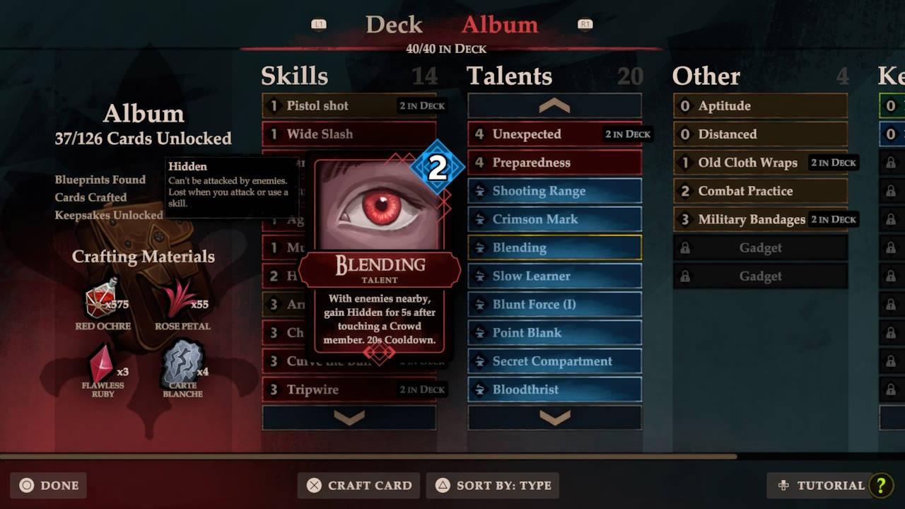 Sendo um RogueLike com vertente de deck building, o que realmente senti foi uma jogabilidade que se assemelha mais a um action RPG no estilo Diablo. Com cartas que nos dão bónus ativos e passivos, que vão mudando o nosso estilo de jogo conforme vamos ultrapassando desafios, desde os simples soldados franceses aos mais poderosos Bosses. O combate decorre em tempo real, com René a utilizar ataques corpo a corpo, disparos de pistola e habilidades especiais para enfrentar os inimigos.