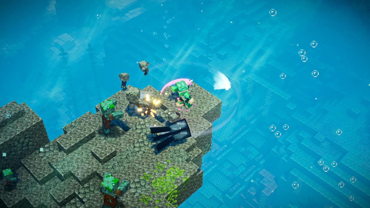 Já o segundo nível, Monumento Abismal, passa-se dentro de um monumento afundado, mais uma vez cheio de inimigos. De alguns já tinha falado anteriormente, mas também teremos um ou outros novos; no entanto, apenas mudam os nomes e o aspecto, porque os seus ataques, na maioria das vezes são semelhantes a inimigos bem conhecidos de outros níveis de Minecraft Dungeons. Este nível é cheio de pequenos quebra-cabeças, o que nos obriga a abrir passagens até uma espécie de labirintos em miniatura. É um daqueles níveis que só se consegue fazer tendo o mapa sempre aberto para irmos andando e sabermos o caminho que temos de percorrer. Além disso, será aqui que vamos encontrar o grande boss desta expansão, o Guardião Ancestral.