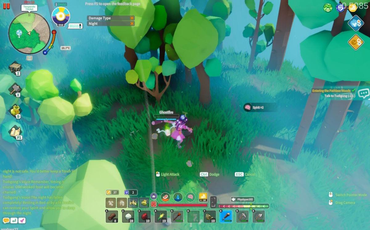Para além de todas as mecânicas que nos são explicadas neste tutorial, também nos é introduzido o barómetro da comida e da água no jogo, ambos igualmente importantes e com grande impacto no gameplay. Caso a nossa personagem fique com fome e os níveis baixem demasiado começaremos a perder HP, por sua vez, se a nossa personagem ficar com sede, então aí diminuirá o nosso nível de stamina no jogo, o que faz com que estas sejam duas dinâmicas muito importantes para conseguirmos ter um jogo fluido.