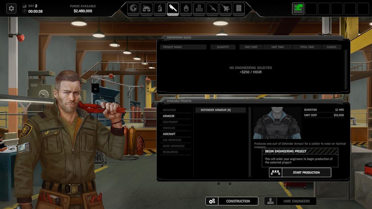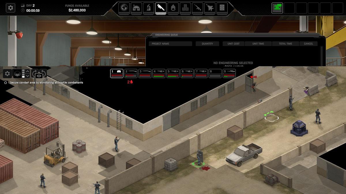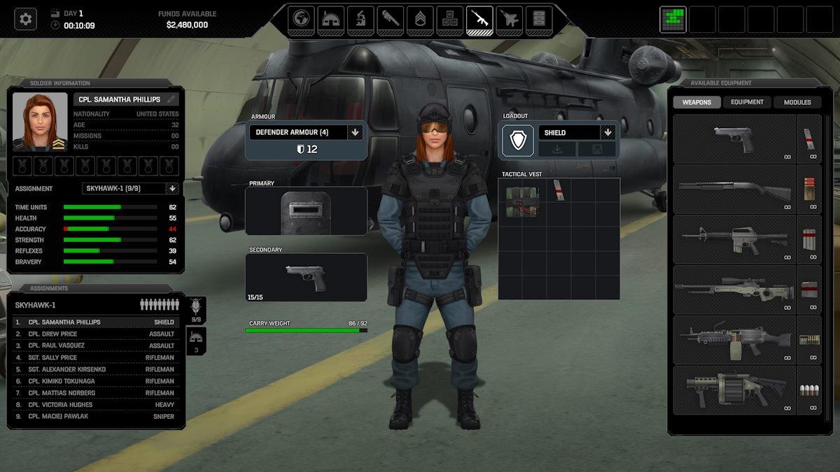Antes de cada batalha começar temos que fazer a gestão de tropas, sendo que cada militar tem status diferentes que influenciam o jogo de maneira diferente. Este parâmetro vai jogar perfeitamente com o equipamento de armas. Determinada arma equipada num militar com características específicas vá ter mais efeito do que outra. Tudo são aspetos que se devem ter em conta para uma maior eficácia no campo de batalha. Temos, ainda, itens que podem ser equipados e usados durante as batalhas, como armas extra, coletes de proteção, granadas, etc.