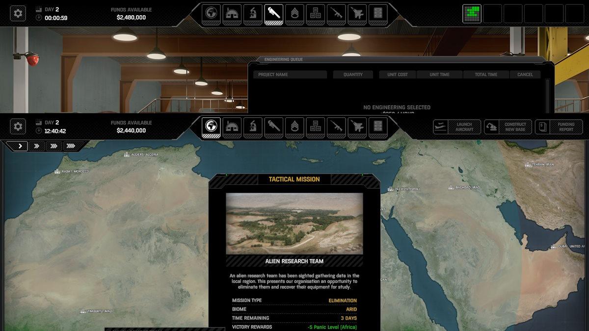 Sempre que uma missão termina, estaremos de volta ao mapa global onde nos será permitido apostar no desenvolvimento tecnológico, ou no desenvolvimento de armamento mais eficaz, ou até mesmo de melhores equipamentos que nos vai permitir desenvolver as nossas bases e melhor monitorizar e defender o espaço aéreo dos alienígenas.