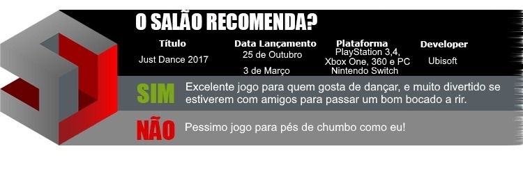 Pois bem, com a chegada da Nintendo Switch chegou também o Just Dance 2017. Um jogo que já tinha saído para várias outras plataformas no mercado, mas que para poderem jogá-lo precisavam do vosso smarthphone, ou noutros casos, de dispositivos extra. Com a Nintendo Switch tudo isso mudou, basta pegarem num dos Joy-Cons e toca a dançar, exercitar, mexer, fazer figuras tristes, etc…