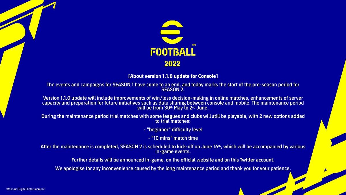 Agora com o final da Season 1, a Konami anunciou que vai entrar em manutenção a partir do dia 30 deste mês até o dia 2 de junho e que a nova Season 2 só vai efectivamente começar no próximo dia 16 de junho. Estamos a falar de quase um mês sempre as Divisões Online do Modo Dream Team, deixando-o apenas à mercê dos eventos semanais.