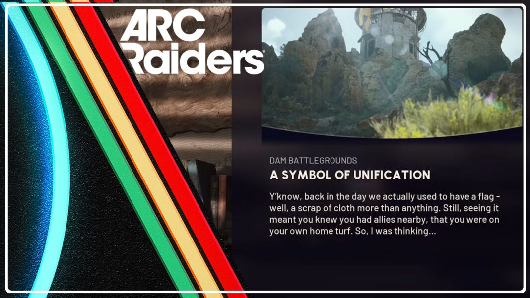 Vais encontrar a missão Um Símbolo da Unificação na região Dam Battlegrounds, sendo dada por Celeste em ARC Raiders. Nesta missão, vais ajudar a restaurar um pouco de esperança entre os Raiders ao erguer uma bandeira no Formicai Outpost. É uma tarefa simples e rápida de completar, que te recompensa com alguns materiais úteis de fabrico.