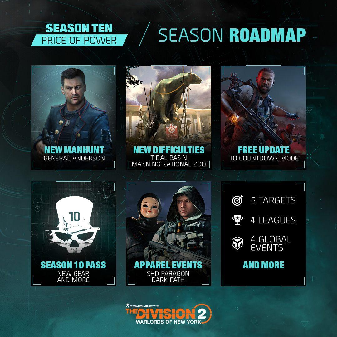 Temporada 10: “Price of Power” será lançada a 13 de setembro, enviando os Agentes numa nova Caça ao Homem. O alvo é o General Peter Anderson, um líder dos True Sons que tenta negociar uma paz com os Black Tusk para, com as suas forças combinadas, tentar aniquiliar a Division.