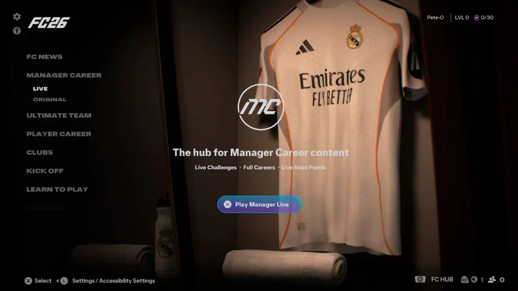 Manager Live é uma nova experiência dentro do Modo Carreira, centrada num Hub dinâmico que traz desafios atualizados semanal e mensalmente. Estas experiências evoluem ao longo da temporada, oferecendo objetivos variados, obstáculos realistas e contextos de jogo que transformam cada carreira numa história própria.