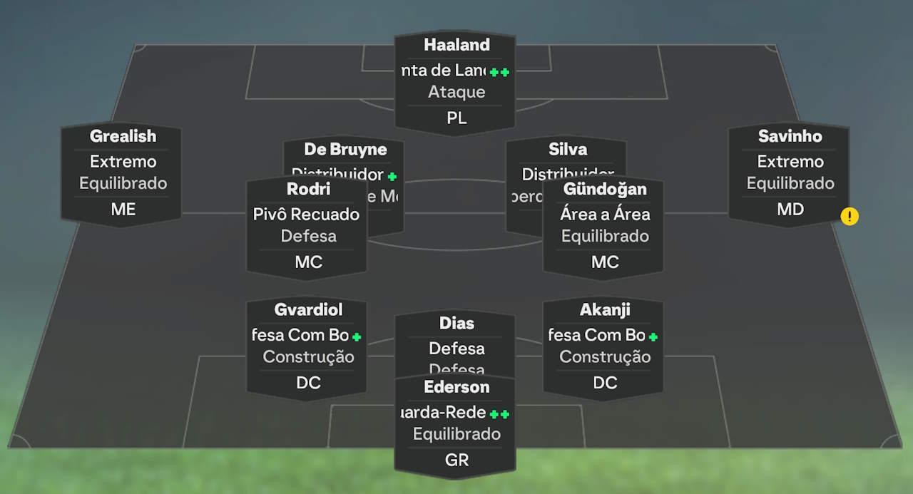 Muios dos elementos que caracterizam o futebol das equipas de Guardiola mantém-se, principalmente o foco em manter a posse da bola e as combinações curtas. No entanto, a sua primeira fase de construção foi mutando, sendo agora praticamente um 3-2-5, tentando aproveitar ao máximo a largura para atrair nas alas, e depois penetrar pelo corredor central. Bernardo Silva e Kevin de Bruyne são jogadores-chave na fase de criação, onde assumem um papel livre para conduzir a equipa até à área. É imperativo saber ter paciência e não perder a bola em zonas de construção, visto que os jogadores, na sua maioria, estarão posicionados à frente da linha da bola.