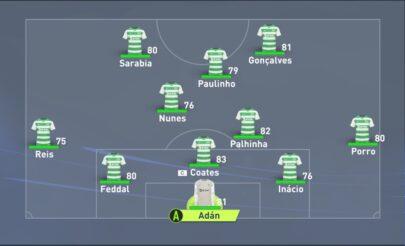Adán mantém-se firme como titular; Gonçalo Inácio ganhou consistência e é agora um dos três centrais juntamente com Coates e Feddal; A verticalidade de Pedro Porro no flanco direito é essencial para os movimentos da equipa, enquanto que do lado oposto, Mateus Reis tenta aproveitar a sua oportunidade; Palhinha é o equilibrador do meio campo, dando liberdade a Matheus Nunes para invadir a área adversária com frequência; Paulinho é o farol do ataque, onde tenta fixar centrais para as entradas de Sarabia e Pedro Gonçalves, formando um trio ofensivo de respeito.