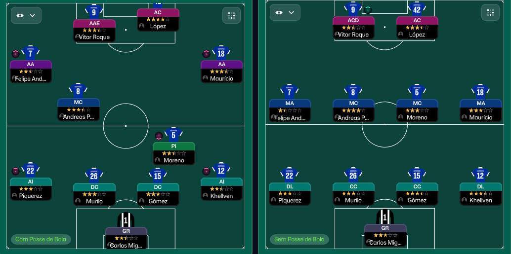 Com a enorme mudança do motor de jogo no Football Manager 26, a forma como se constroem as táticas mudou substancialmente, obrigando o jogador a pensar separadamente os posicionamentos e comportamentos com bola e sem bola. É uma novidade que na minha opinião já fazia sentido há muito tempo, e que felizmente chegou na edição deste ano. Como tal, será assim que exemplificaremos a tática em questão, não só em termos de sistemas e tarefas, mas também, mais à frente, nas Instruções à Equipa.