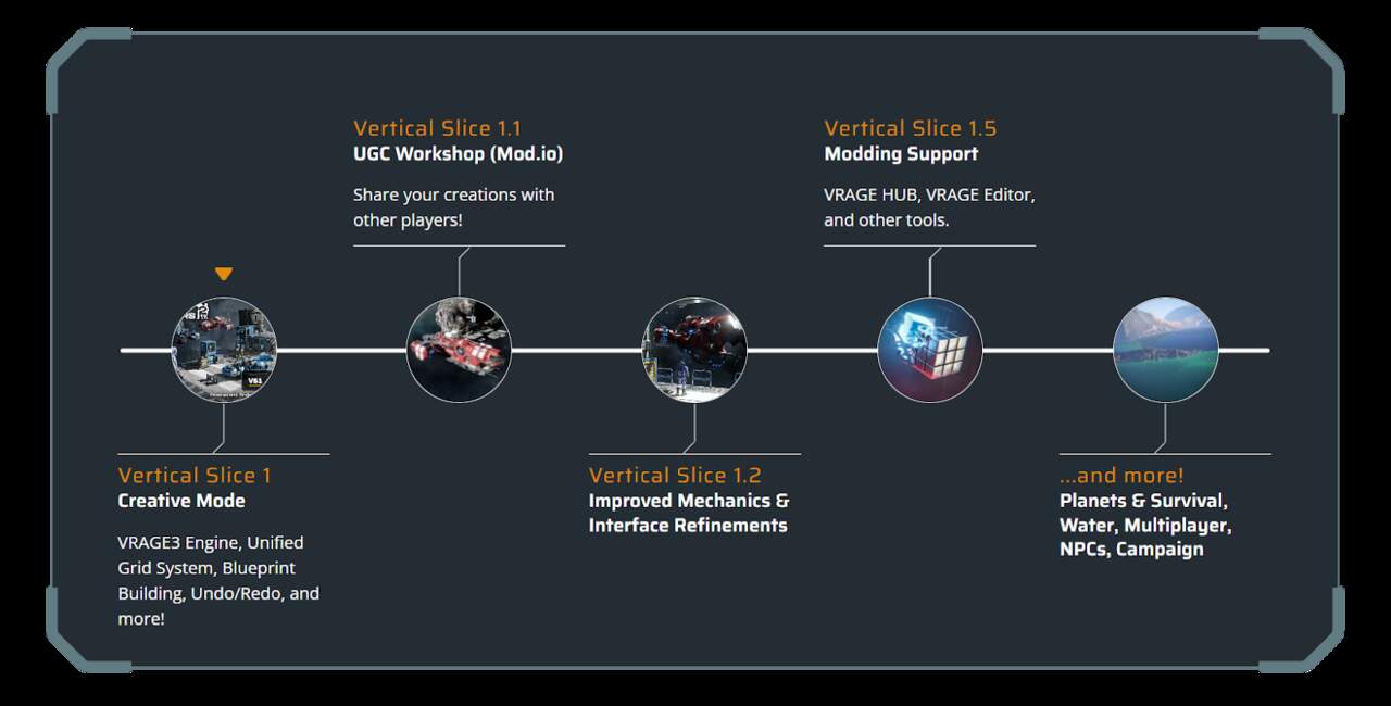 A Keen Software House apresenta uma abordagem única para futuras atualizações de conteúdo, focando-se em Vertical Slices individuais — partes totalmente jogáveis do jogo com funcionalidades principais específicas. Dada a complexidade das mecânicas do jogo, é importante para o estúdio manter-se em contacto com os jogadores, aprender com as suas experiências em cada slice e incorporar o feedback antes de avançar para a próxima atualização de conteúdo.